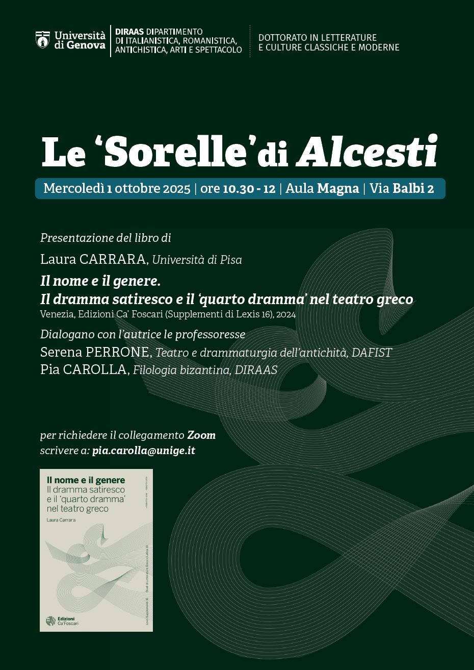 L'incontro, organizzato nell’ambito del Dottorato in Letterature e Culture Classiche e Moderne (DIRAAS), è dedicato alla presentazione del volume di Laura Carrara (Università di Pisa), Il nome e il genere. Il dramma satiresco e il ‘quarto dramma’ nel teatro greco (Venezia, Edizioni Ca’ Foscari, Supplementi di Lexis 16, 2024).